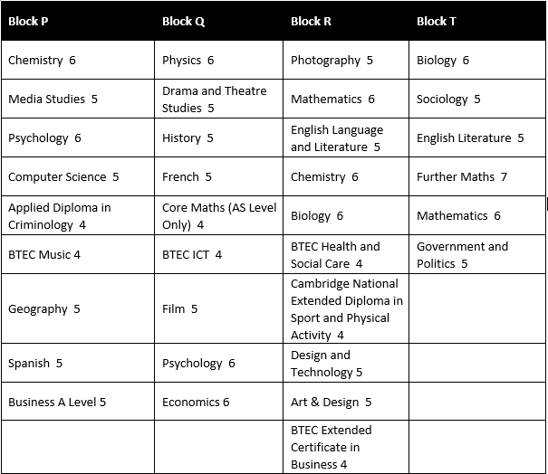 Subject blocks for 2024-25 with entry requirements